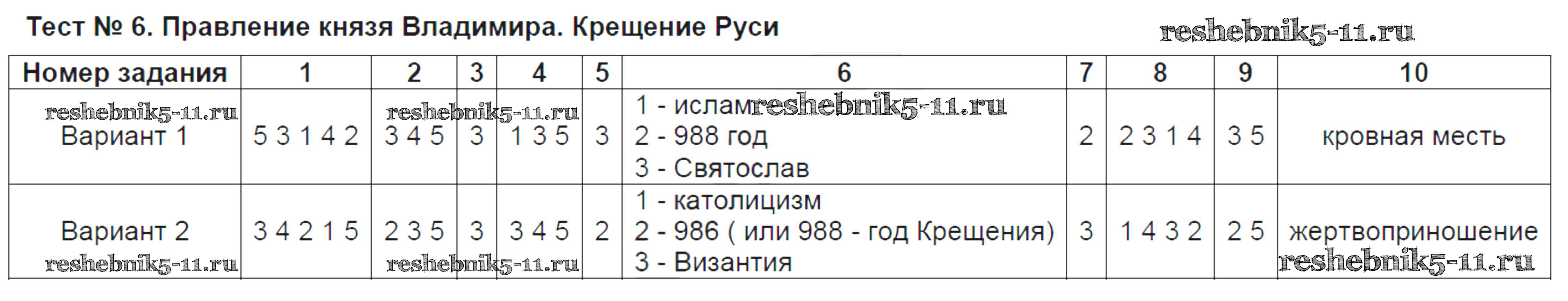 Готовая домашняя работа с ответами по Истории за 6 класс Воробьёва Тесты УМК Часть 1, 2 Экзамен 2017 ФГОС - Тесты Тест №6. Правление князя Владимира. Крещение Руси