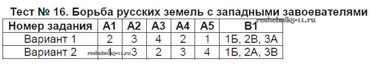 Готовая домашняя работа с ответами по Истории за 6 класс Волкова Контрольно-измерительные материалы (КИМ) ВАКО 2017 ФГОС - Тесты Тест №16. Борьба русских земель с западными завоевателями