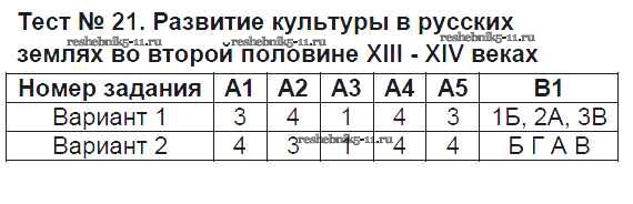Готовая домашняя работа с ответами по Истории за 6 класс Волкова Контрольно-измерительные материалы (КИМ) ВАКО 2017 ФГОС - Тесты Тест №21. Развитие культуры в русских землях во второй половине XIII - XIV веках