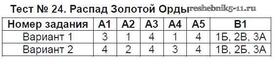 Готовая домашняя работа с ответами по Истории за 6 класс Волкова Контрольно-измерительные материалы (КИМ) ВАКО 2017 ФГОС - Тесты Тест №24. Распад Золотой Орды