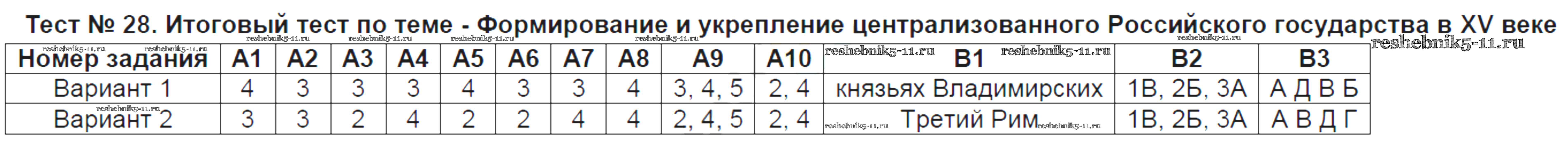 Готовая домашняя работа с ответами по Истории за 6 класс Волкова Контрольно-измерительные материалы (КИМ) ВАКО 2017 ФГОС - Тесты Тест №28. Итоговый тест по теме - Формирование и укрепление централизованного Российского государства в XV веке