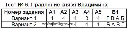 Готовая домашняя работа с ответами по Истории за 6 класс Волкова Контрольно-измерительные материалы (КИМ) ВАКО 2017 ФГОС - Тесты Тест №6. Правление князя Владимира