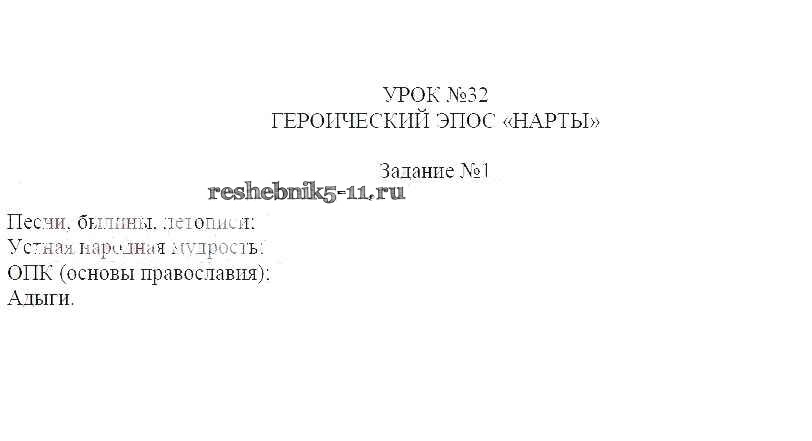 Готовая домашняя работа с ответами по Кубановедению за 6 класс Голикова, Морозова, Прядущенко Рабочая тетрадь Традиция 2019 ФГОС - Урок № 32. Героический эпос «Нарты» 1