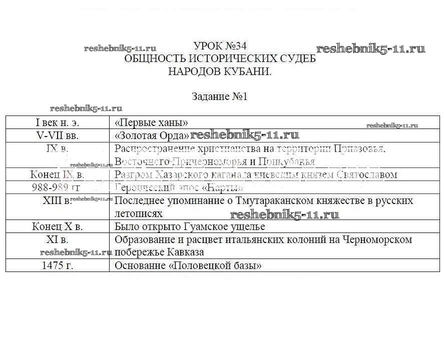 Готовая домашняя работа с ответами по Кубановедению за 6 класс Голикова, Морозова, Прядущенко Рабочая тетрадь Традиция 2019 ФГОС - Урок № 34. Общность исторических судеб народов Кубани 1