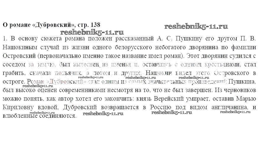 Решебник / часть 1 / О романе «Дубровский», стр. 138 / 1
