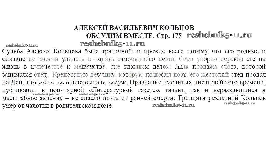 Литература за 6 класс Ланин Учебник Алгоритм успеха Вентана-граф Алексей Васильевич Кольцов Обсудим вместе стр.175