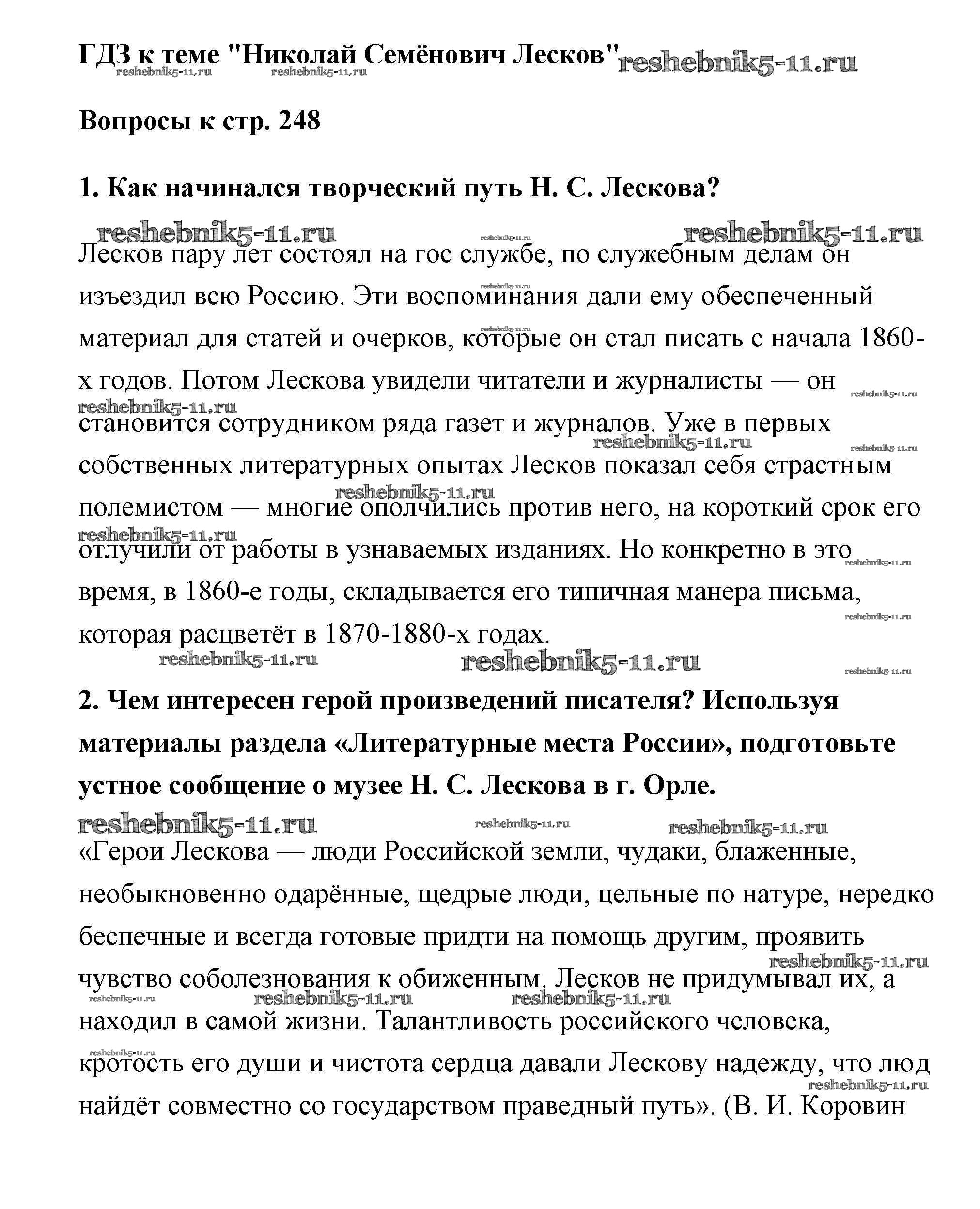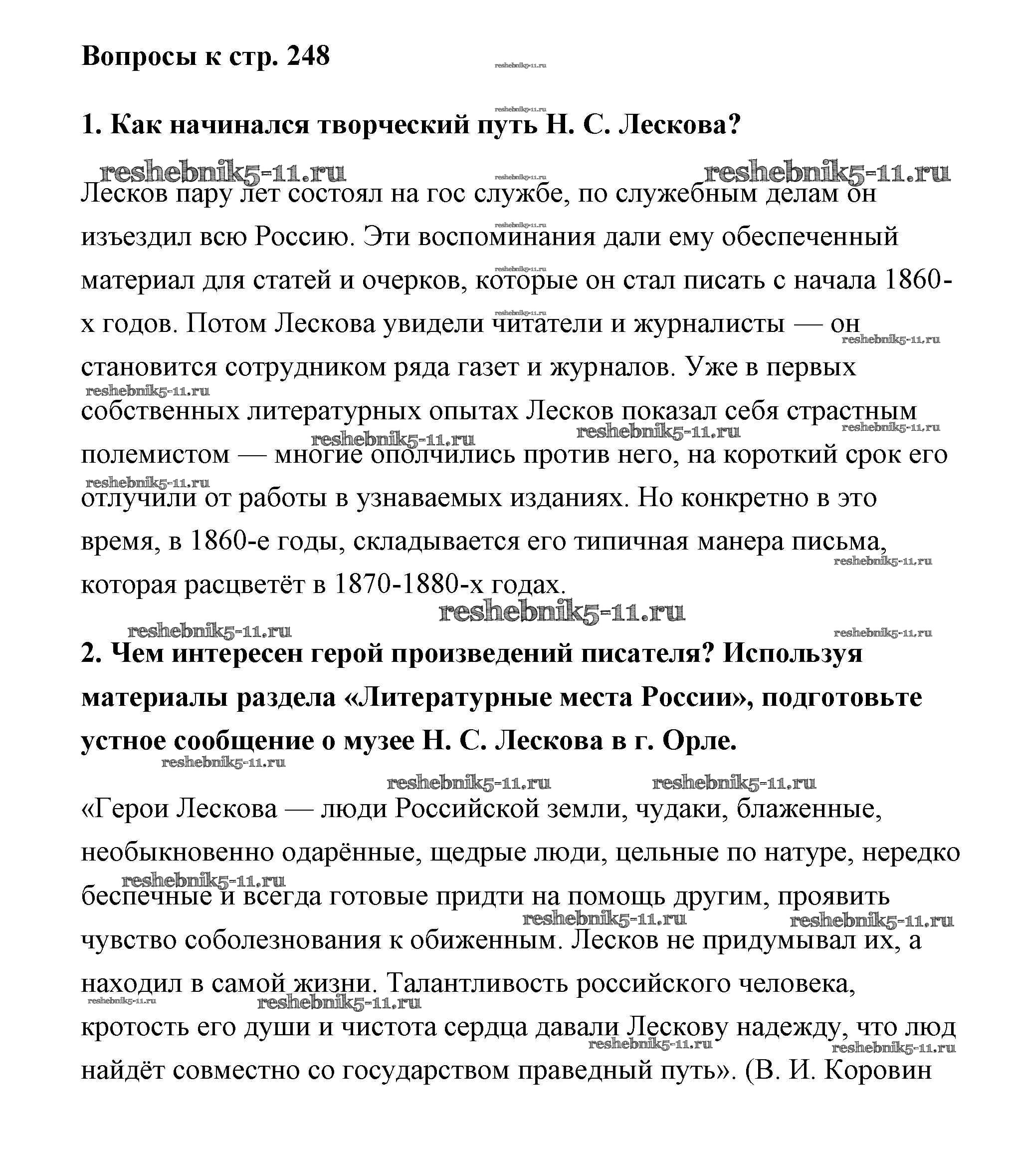 Готовая домашняя работа с ответами по Литературе за 6 класс Полухина, Коровина, Журавлев Учебник Часть 1 Просвещение 2016 ФГОС - Лесков страница 248