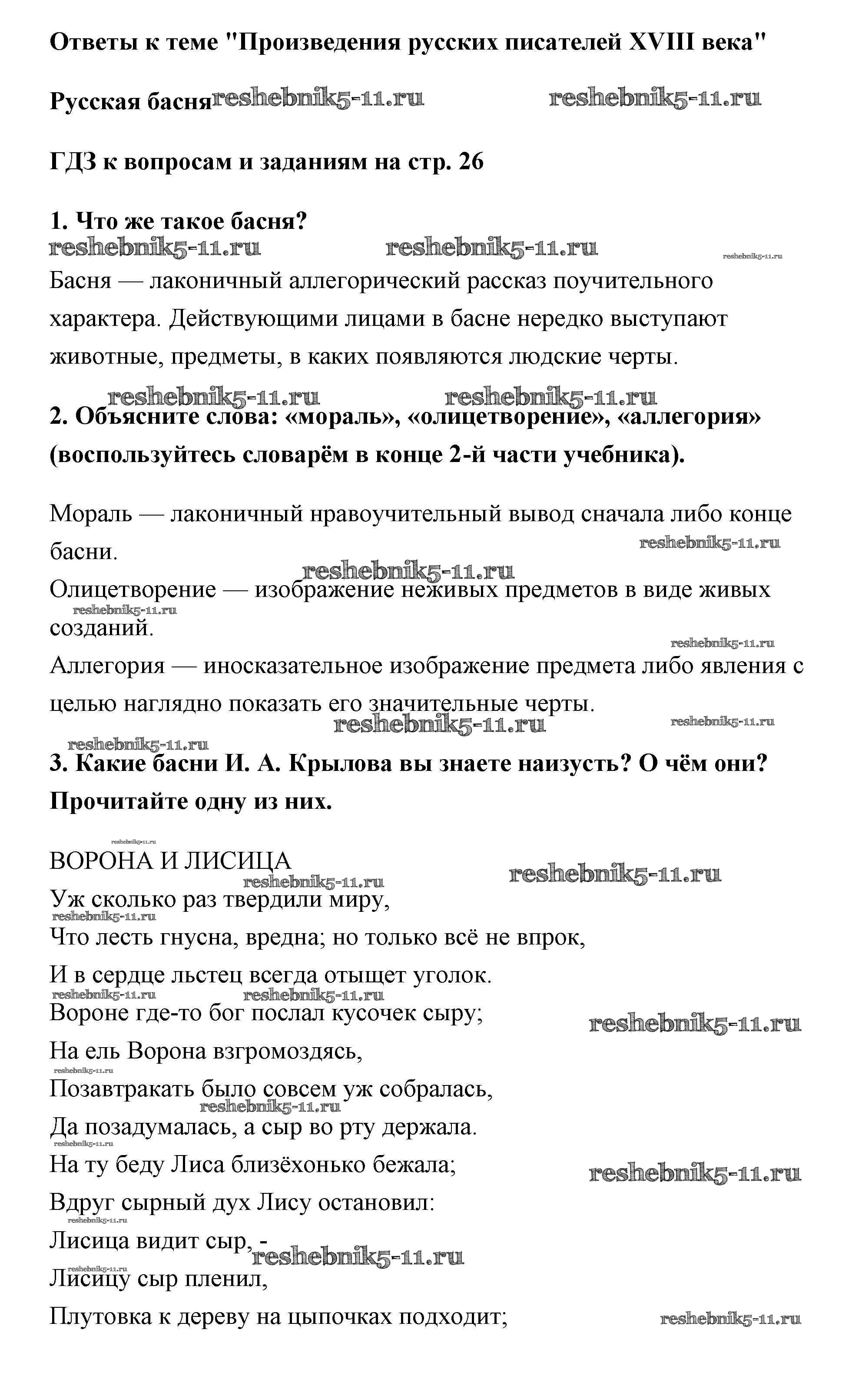 Готовая домашняя работа с ответами по Литературе за 6 класс Полухина, Коровина, Журавлев Учебник Часть 1 Просвещение 2016 ФГОС - Произведения русских писателей 18 века страница 26