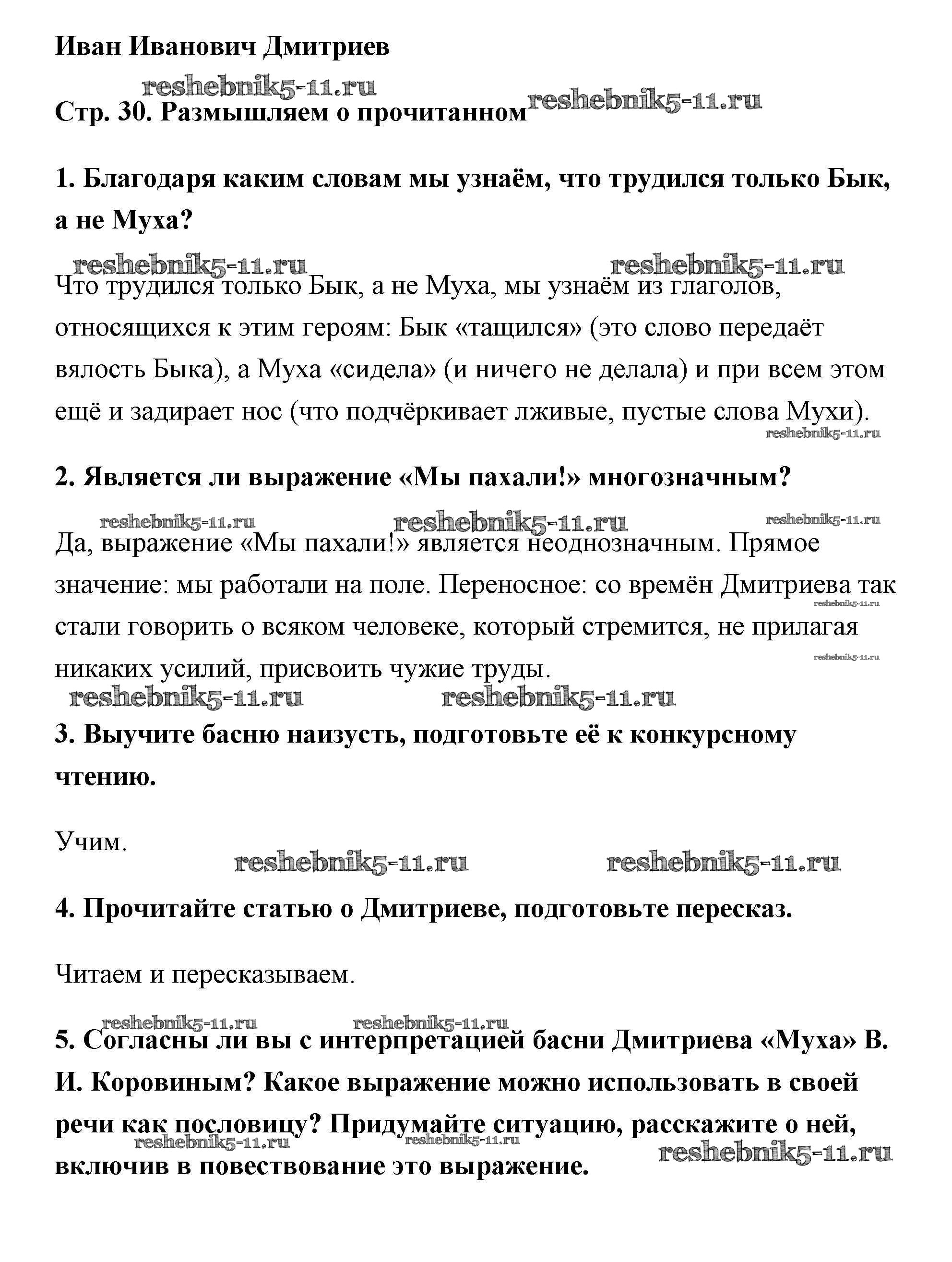 Готовая домашняя работа с ответами по Литературе за 6 класс Полухина, Коровина, Журавлев Учебник Часть 1 Просвещение 2016 ФГОС - Произведения русских писателей 18 века страница 30