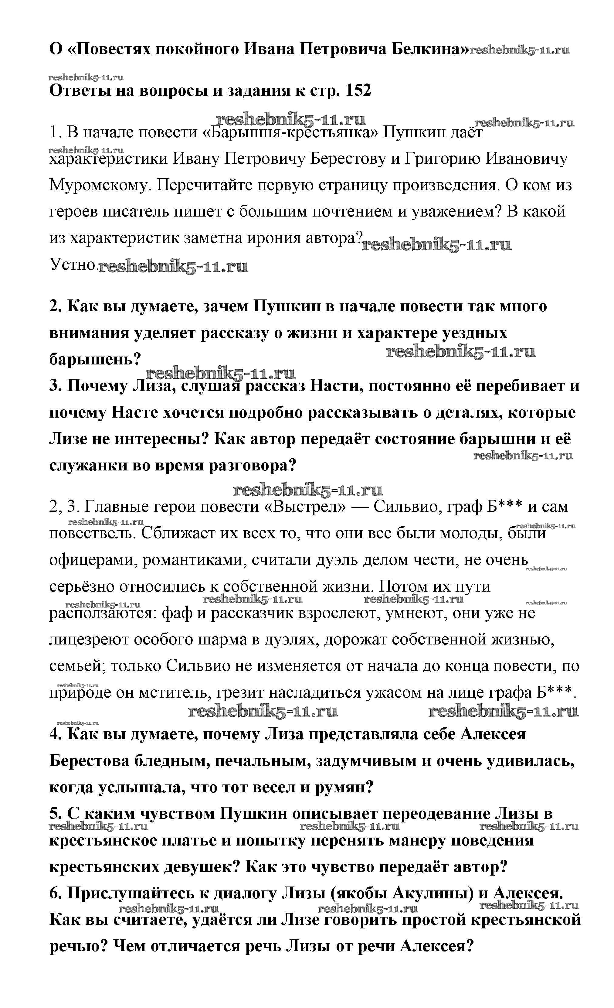 Готовая домашняя работа с ответами по Литературе за 6 класс Полухина, Коровина, Журавлев Учебник Часть 1 Просвещение 2016 ФГОС - Пушкин страница 152