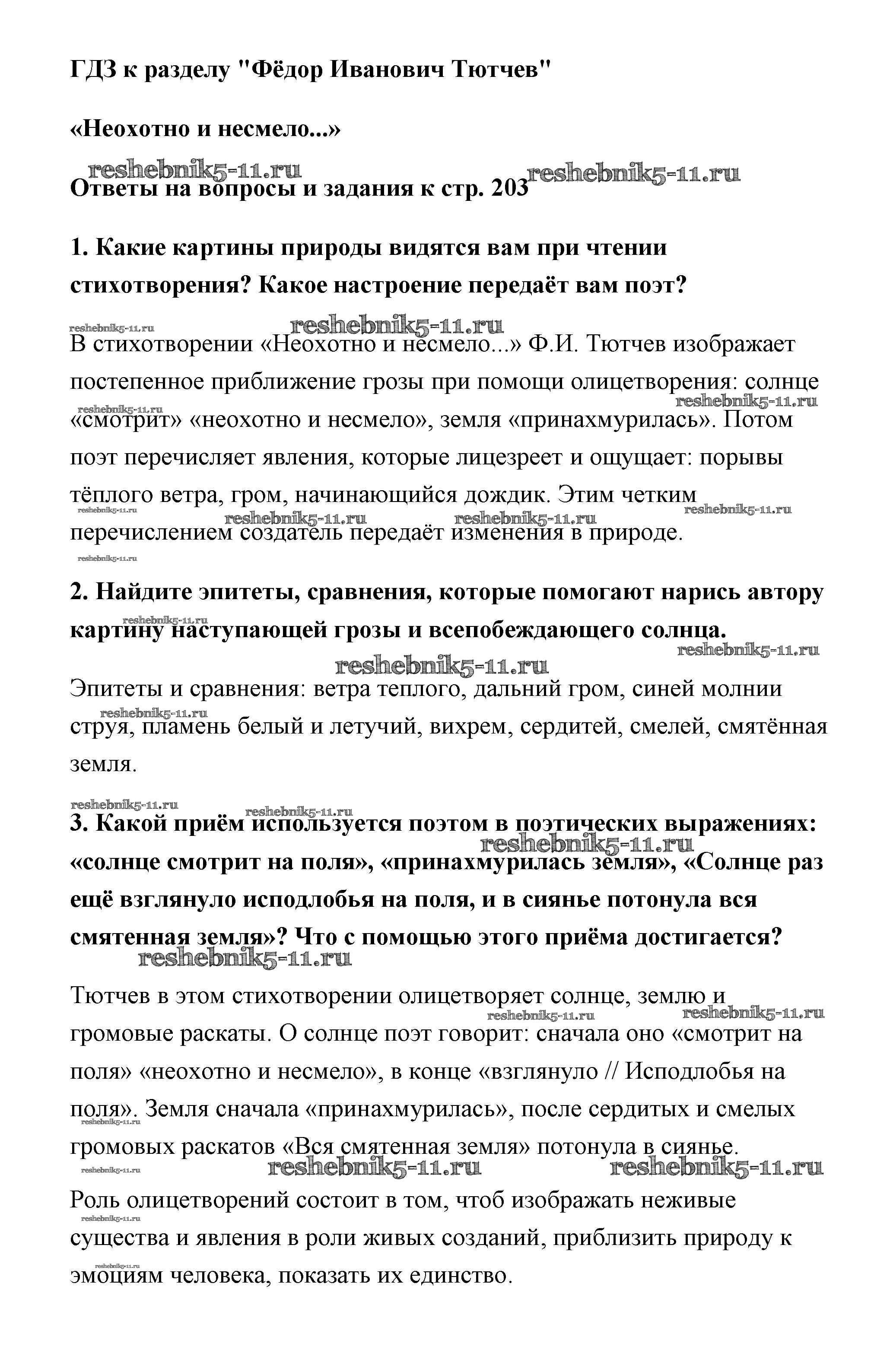 Готовая домашняя работа с ответами по Литературе за 6 класс Полухина, Коровина, Журавлев Учебник Часть 1 Просвещение 2016 ФГОС - Тютчев страница 203