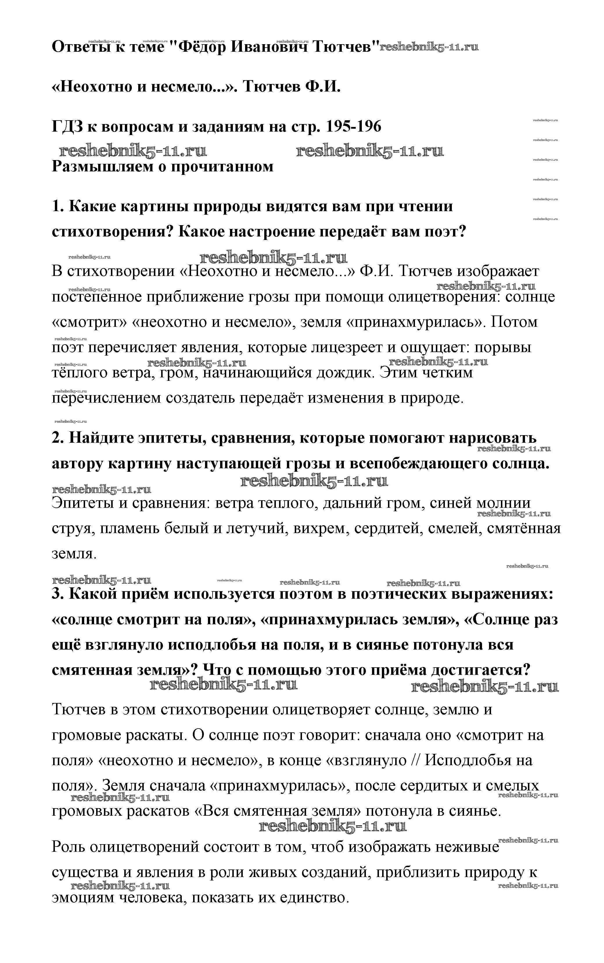 Готовая домашняя работа с ответами по Литературе за 6 класс Полухина, Коровина, Журавлев Учебник Часть 1 Просвещение 2016 ФГОС - Тютчев страница 195-196