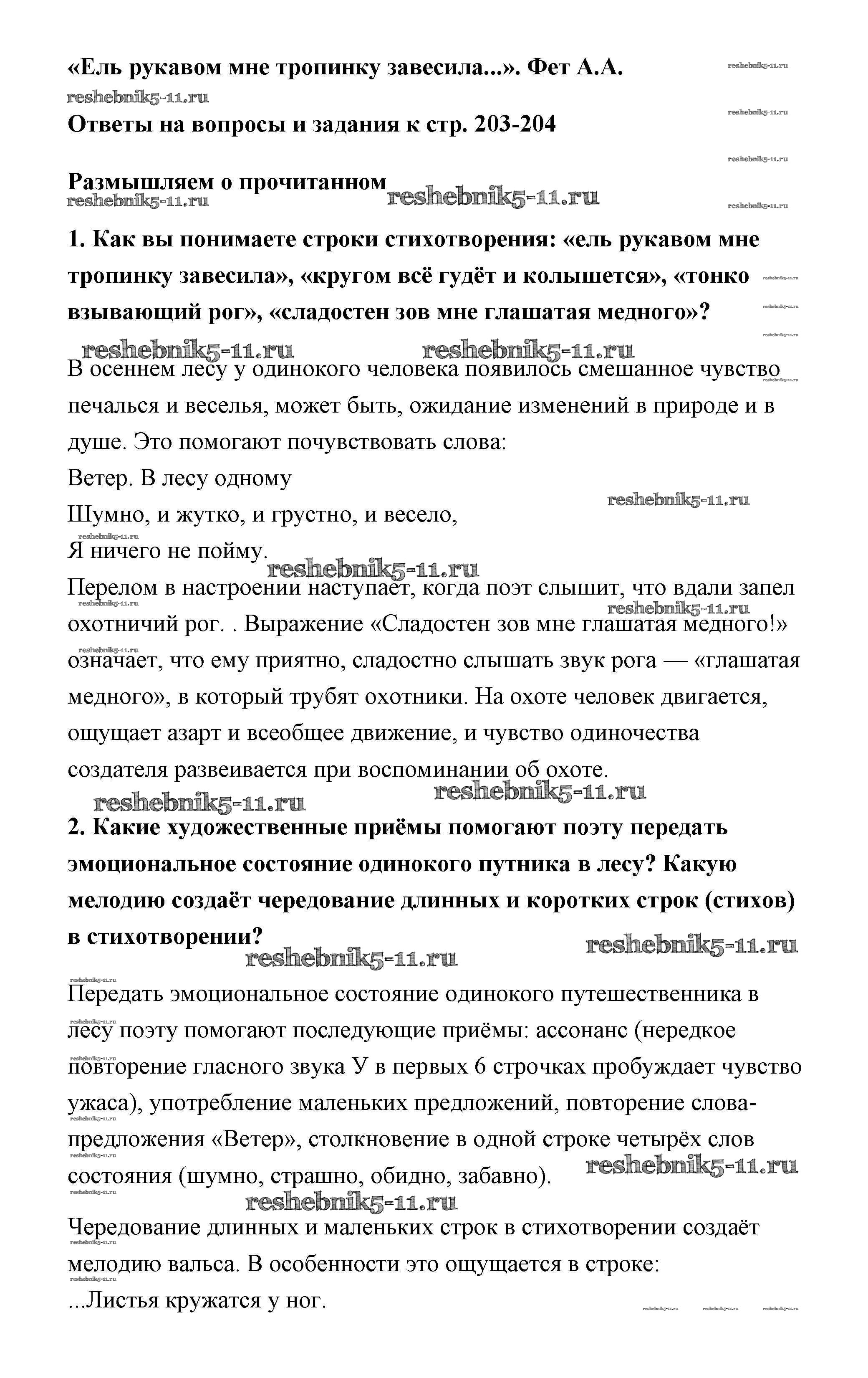 Готовая домашняя работа с ответами по Литературе за 6 класс Полухина, Коровина, Журавлев Учебник Часть 1 Просвещение 2016 ФГОС - Фет страница 203-204