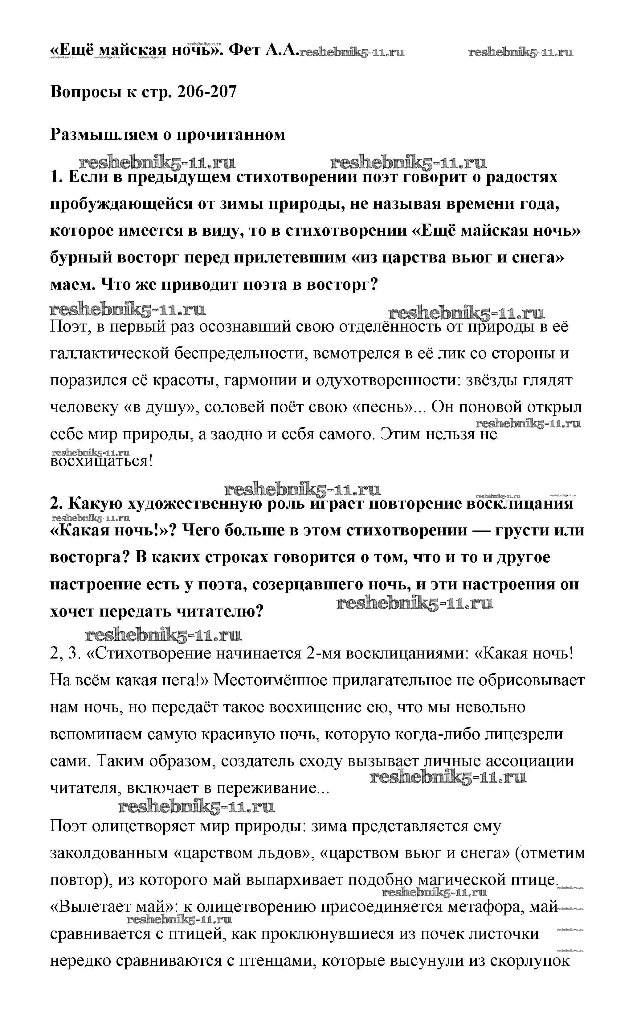 Готовая домашняя работа с ответами по Литературе за 6 класс Полухина, Коровина, Журавлев Учебник Часть 1 Просвещение 2016 ФГОС - Фет страница 206-207