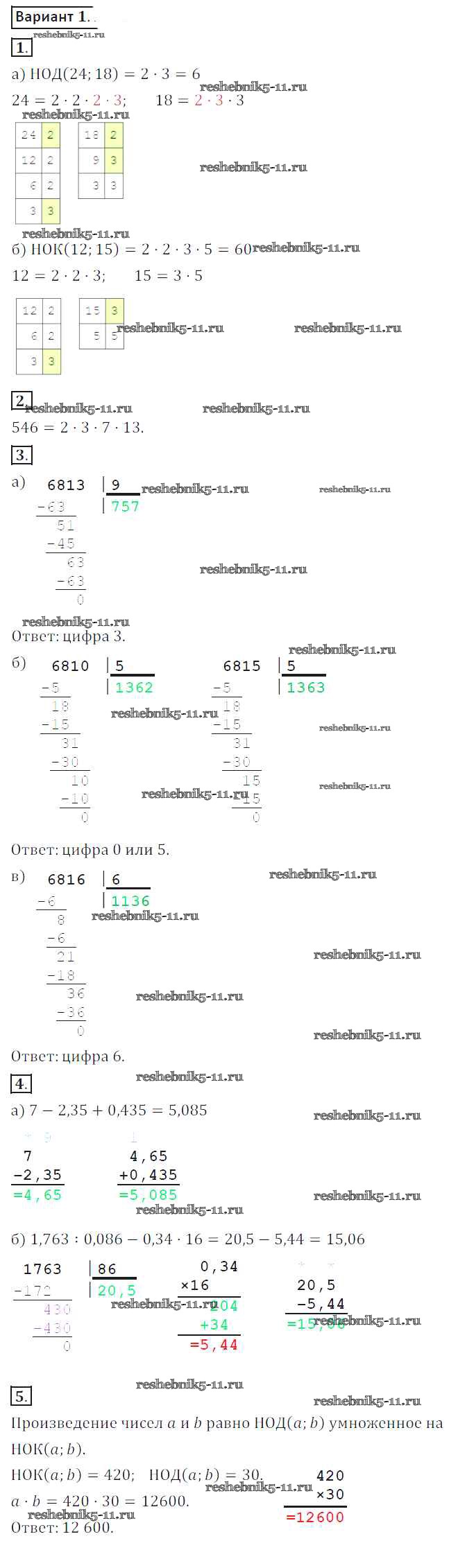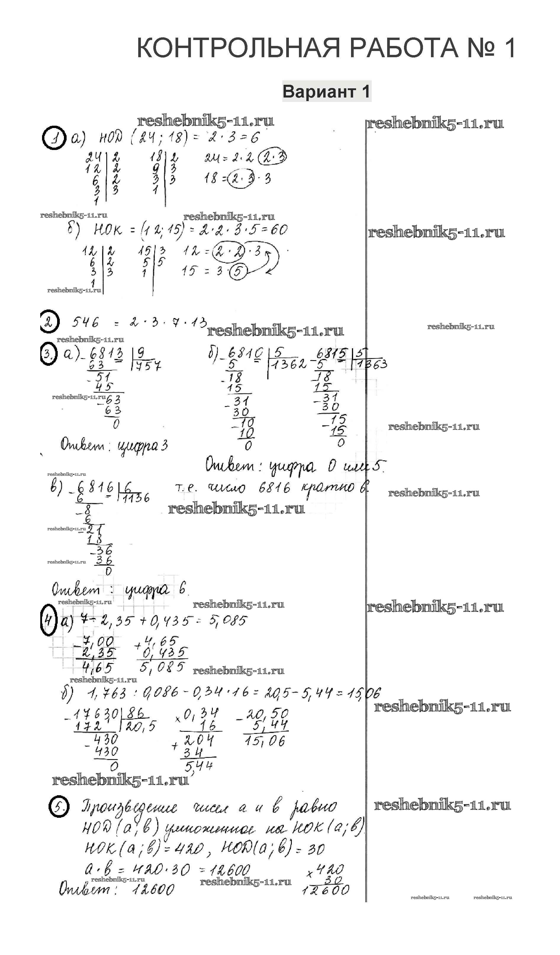Готовая домашняя работа с ответами по Математике за 6 класс Жохов, Крайнева Контрольные работы Мнемозина 2011 ФГОС - КР-1. Варианты 1
