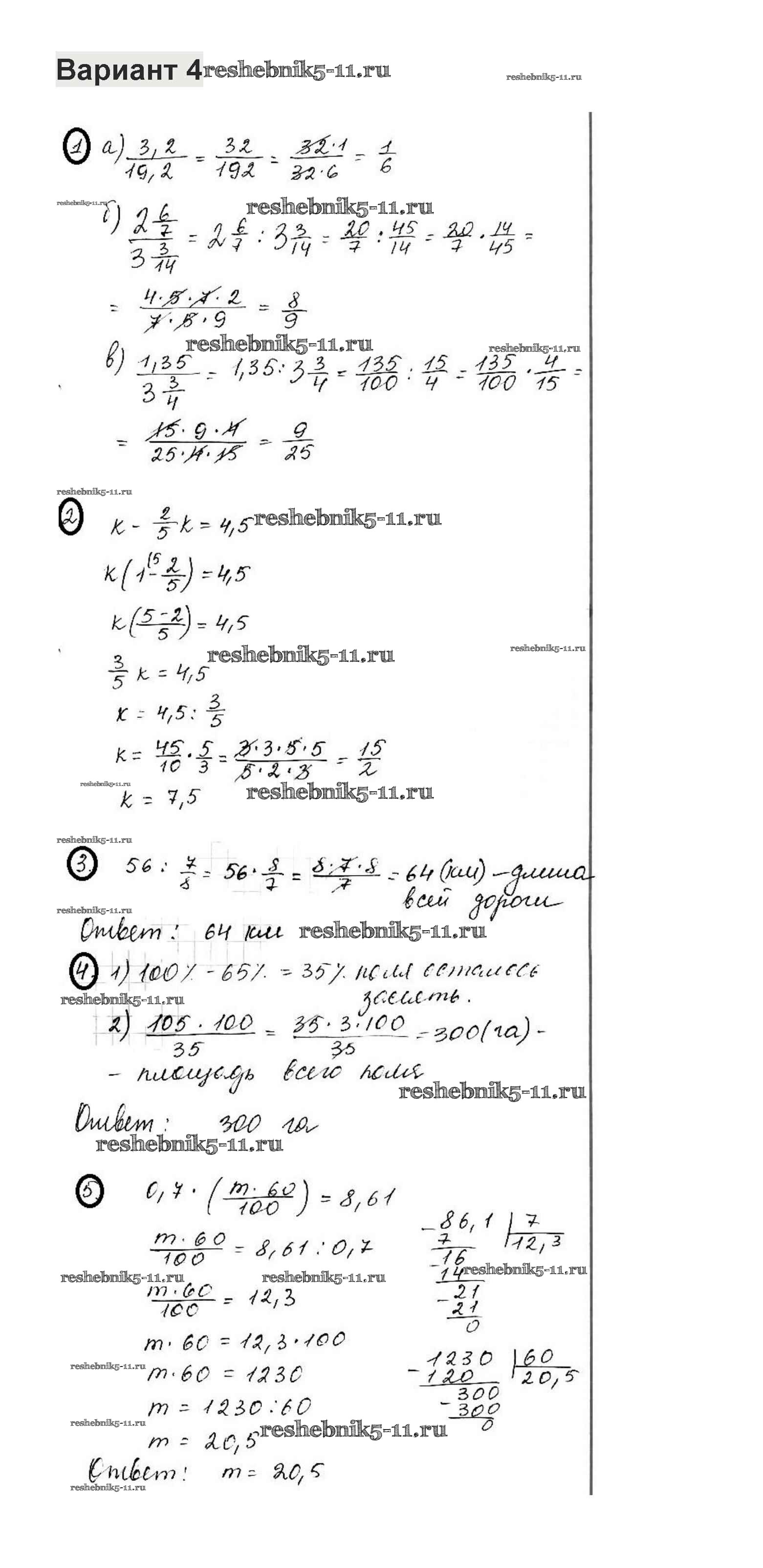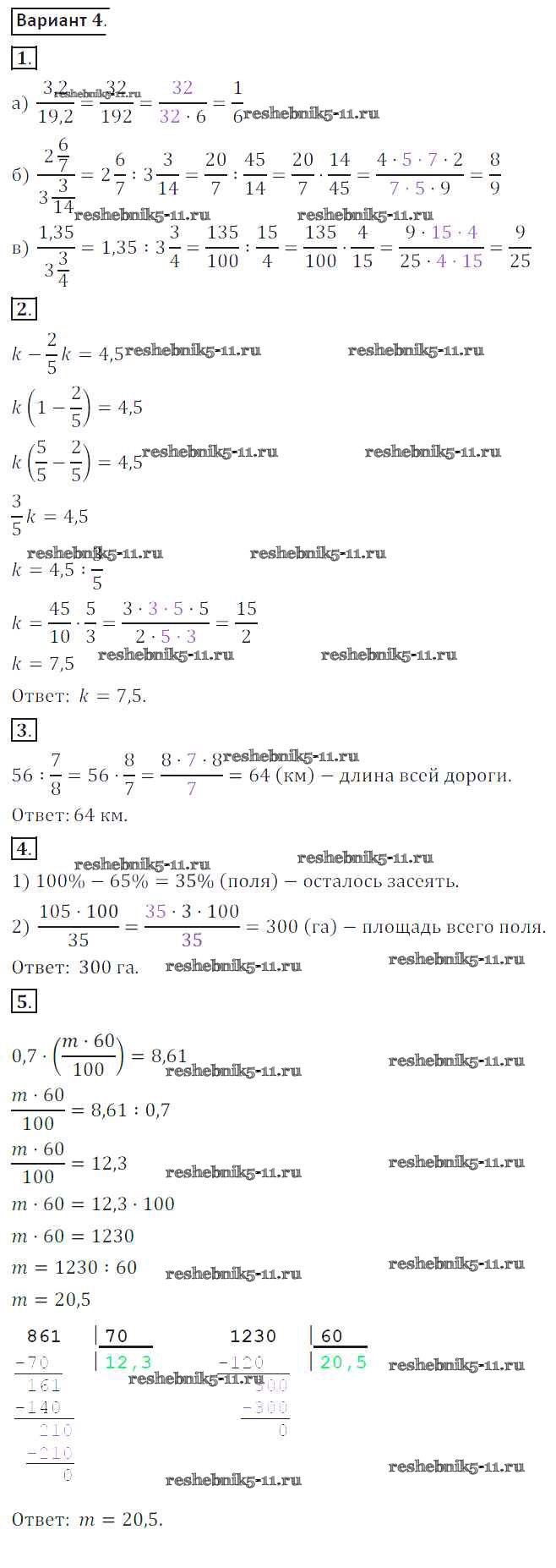 Готовая домашняя работа с ответами по Математике за 6 класс Жохов, Крайнева Контрольные работы Мнемозина 2011 ФГОС - КР-6. Варианты 4
