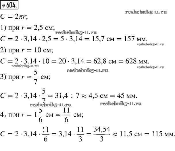 Готовая домашняя работа с ответами по Математике за 6 класс Муравин, Муравина Учебник Вертикаль Дрофа 2016 ФГОС - §20. Длина окружности и площадь круга 604
