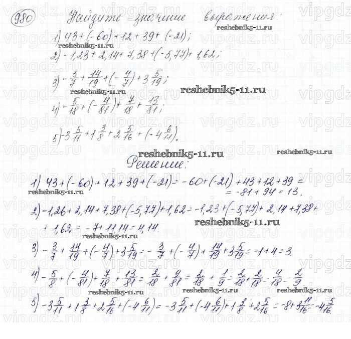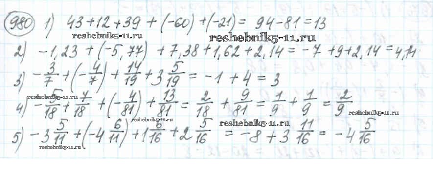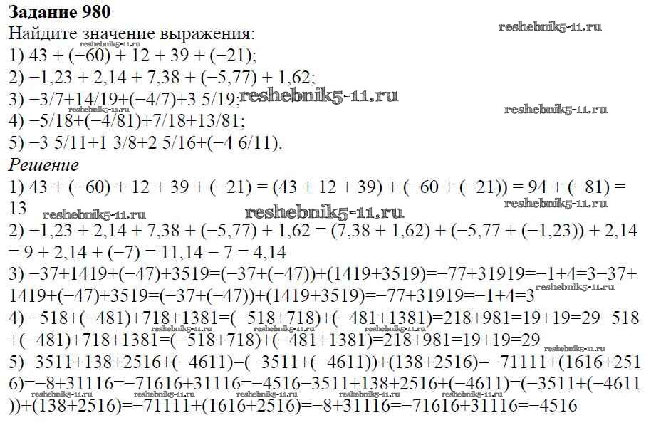 Готовая домашняя работа с ответами по Математике за 6 класс Мерзляк, Полонский, Якир Учебник Алгоритм успеха Вентана-граф 2016 ФГОС - Глава 4. Рациональные числа и действия над ними (упражнения) 980
