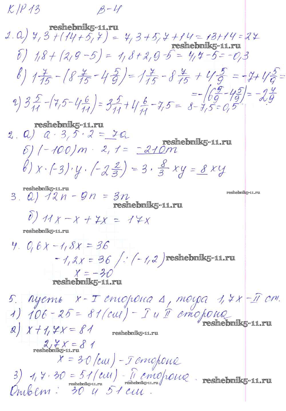 Готовая домашняя работа с ответами по Математике за 6 класс Дудницын, Кронгауз Контрольные работы УМК Экзамен 2013 ФГОС - КР-13. Варианты 4