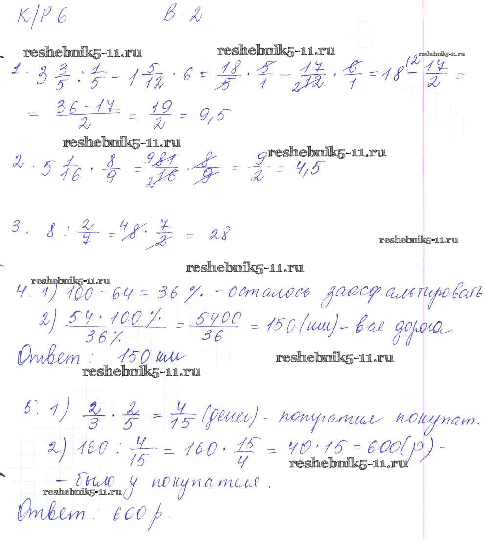 Готовая домашняя работа с ответами по Математике за 6 класс Дудницын, Кронгауз Контрольные работы УМК Экзамен 2013 ФГОС - КР-6. Варианты 2