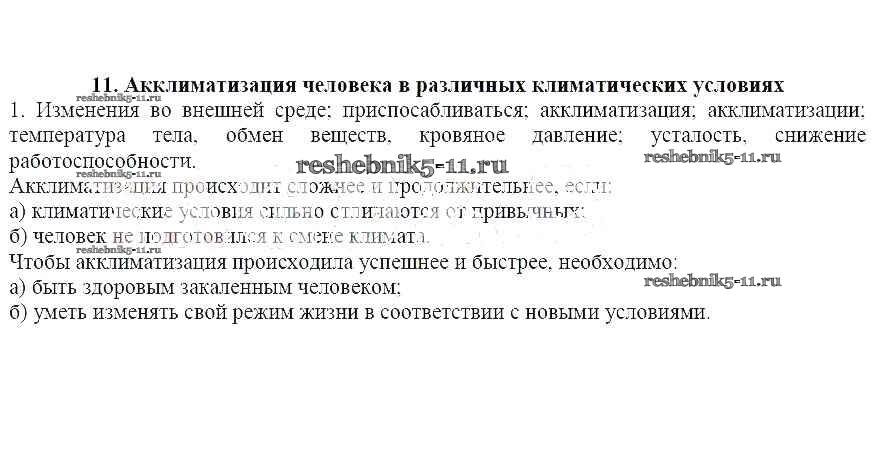 Готовая домашняя работа с ответами по ОБЖ за 6 класс Егорова Рабочая тетрадь Лицей 2012 ФГОС - 11. Акклиматизация человека в различных климатических условиях 1
