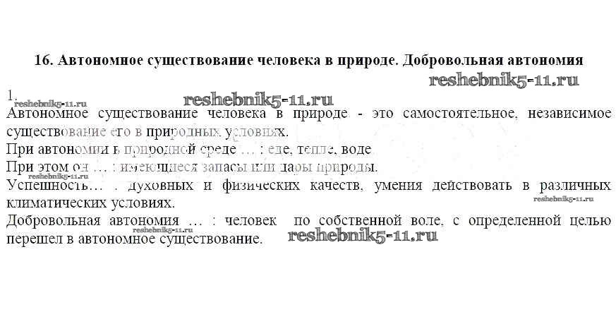 Готовая домашняя работа с ответами по ОБЖ за 6 класс Егорова Рабочая тетрадь Лицей 2012 ФГОС - 16. Автономное существование человека в природе. Добровольная автономия 1