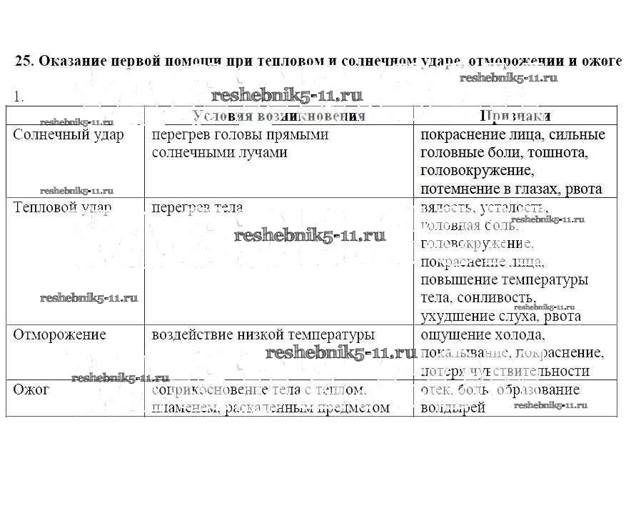 Готовая домашняя работа с ответами по ОБЖ за 6 класс Егорова Рабочая тетрадь Лицей 2012 ФГОС - 25. Оказание первой помощи при тепловом и солнечном ударе, отморожении и ожоге 1