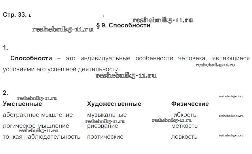 Готовая домашняя работа с ответами по Обществознанию за 6 класс Соболева Рабочая тетрадь УМК Вентана-граф 2019 ФГОС - § 9. Способности стр. 33