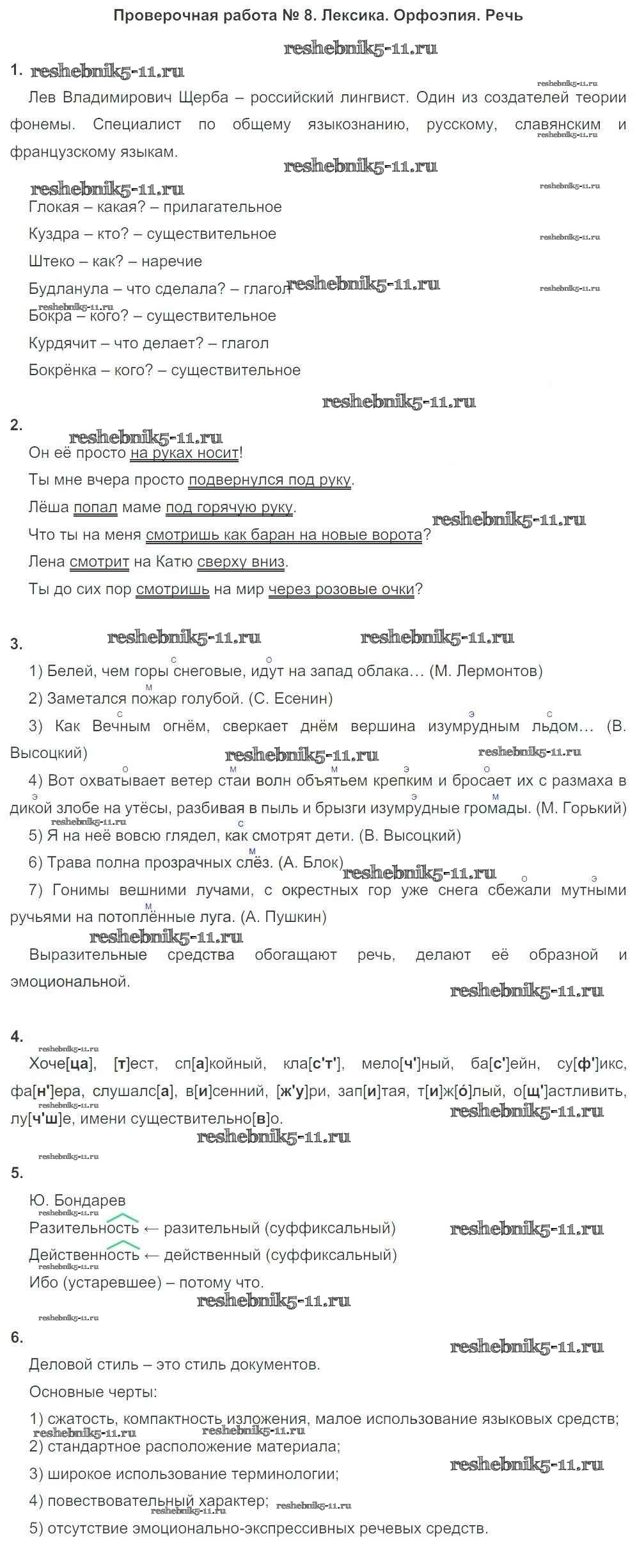 Готовая домашняя работа с ответами по Русскому языку за 6 класс Львов Тетрадь для оценки качества знаний Вертикаль Дрофа 2015 ФГОС - Проверочные работы ПР №8. Лексика. Орфоэпия. Речь
