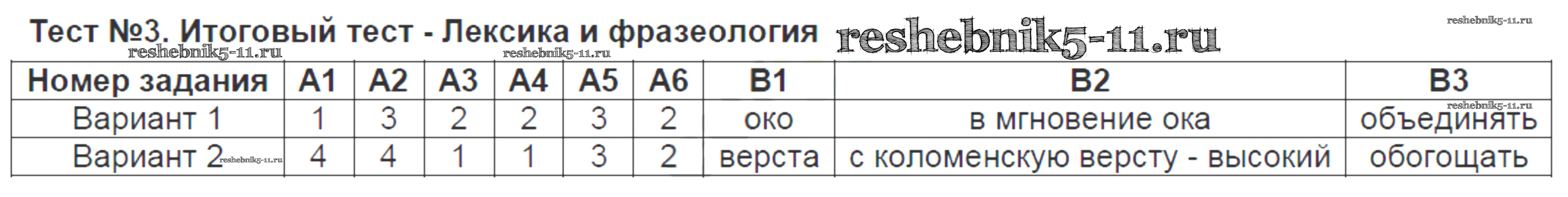 Готовая домашняя работа с ответами по Русскому языку за 6 класс Аксенова Контрольно-измерительные материалы (КИМ) Экзамен 2014 ФГОС - Тесты Тест-3. Итоговый тест - Лексика и фразеология