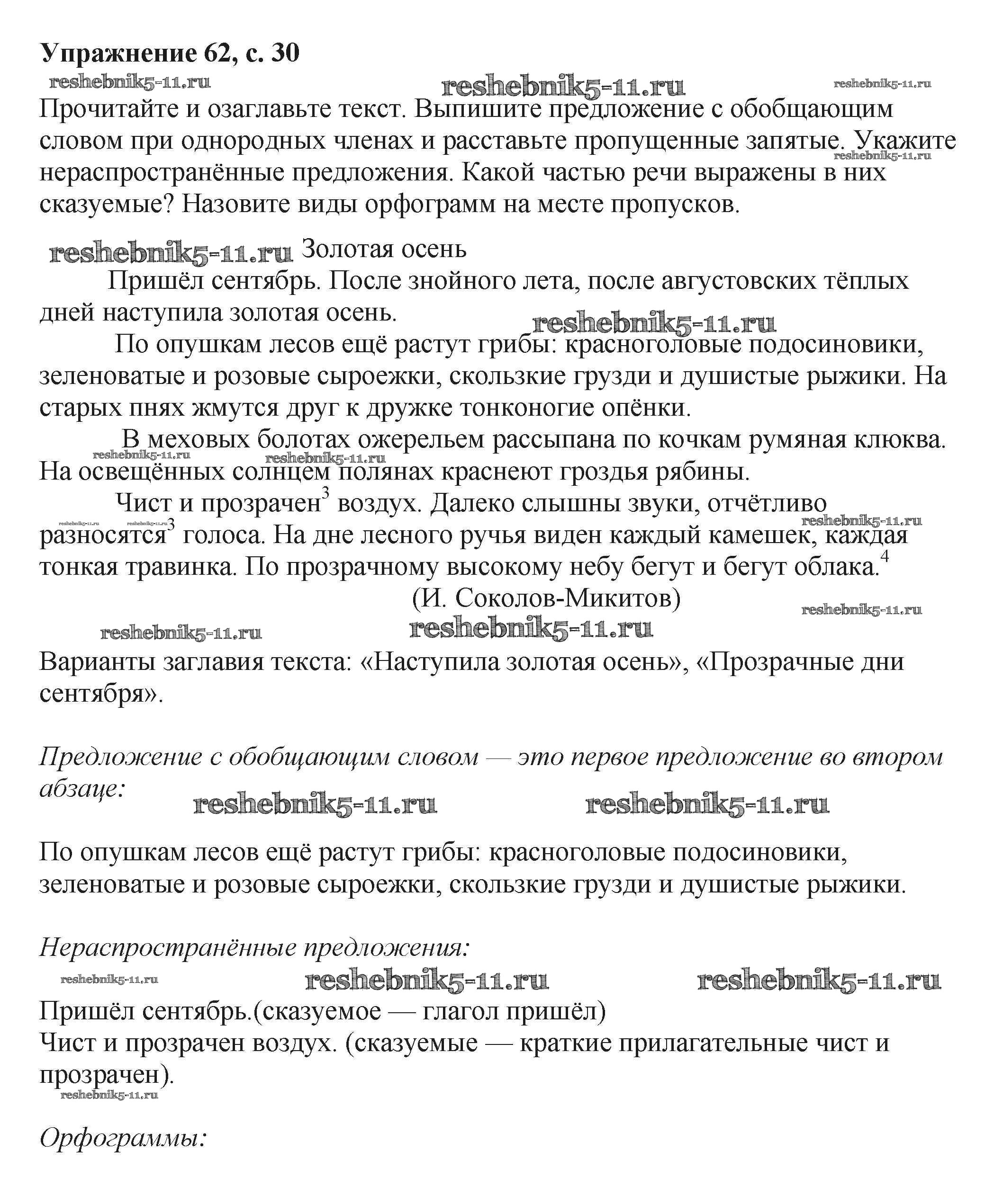 Готовая домашняя работа с ответами по Русскому языку за 6 класс Баранов, Ладыженская, Тростенцова, Григорян, Кулибаба Учебник Часть 1, 2 Просвещение 2015 ФГОС - Упражнения 62