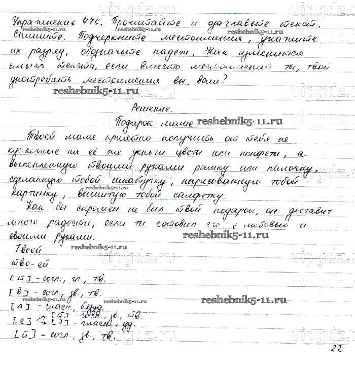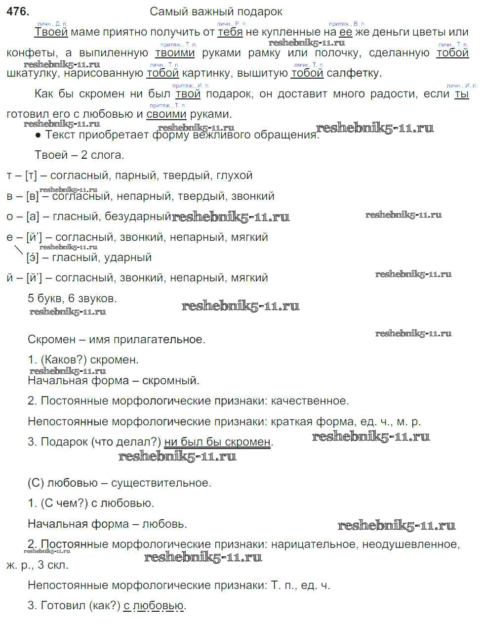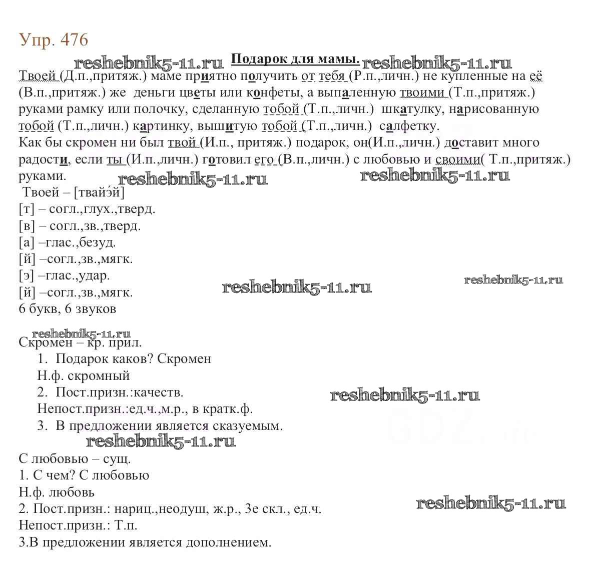 Готовая домашняя работа с ответами по Русскому языку за 6 класс Баранов, Ладыженская, Тростенцова, Григорян, Кулибаба Учебник Часть 1, 2 Просвещение 2015 ФГОС - Упражнения 476