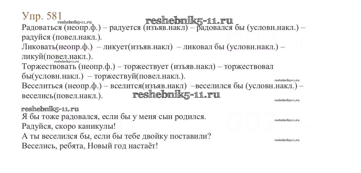 Готовая домашняя работа с ответами по Русскому языку за 6 класс Баранов, Ладыженская, Тростенцова, Григорян, Кулибаба Учебник Часть 1, 2 Просвещение 2015 ФГОС - Упражнения 581
