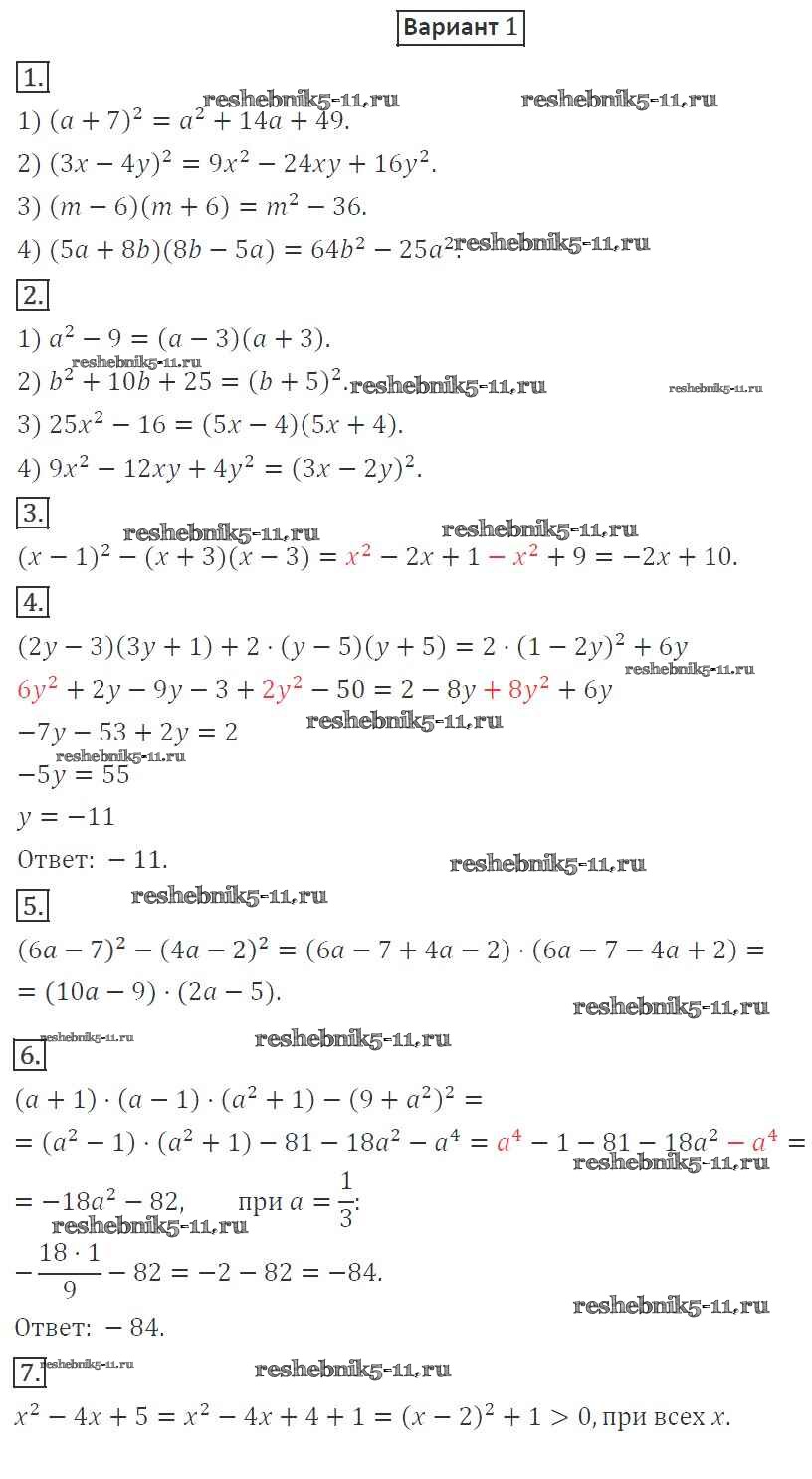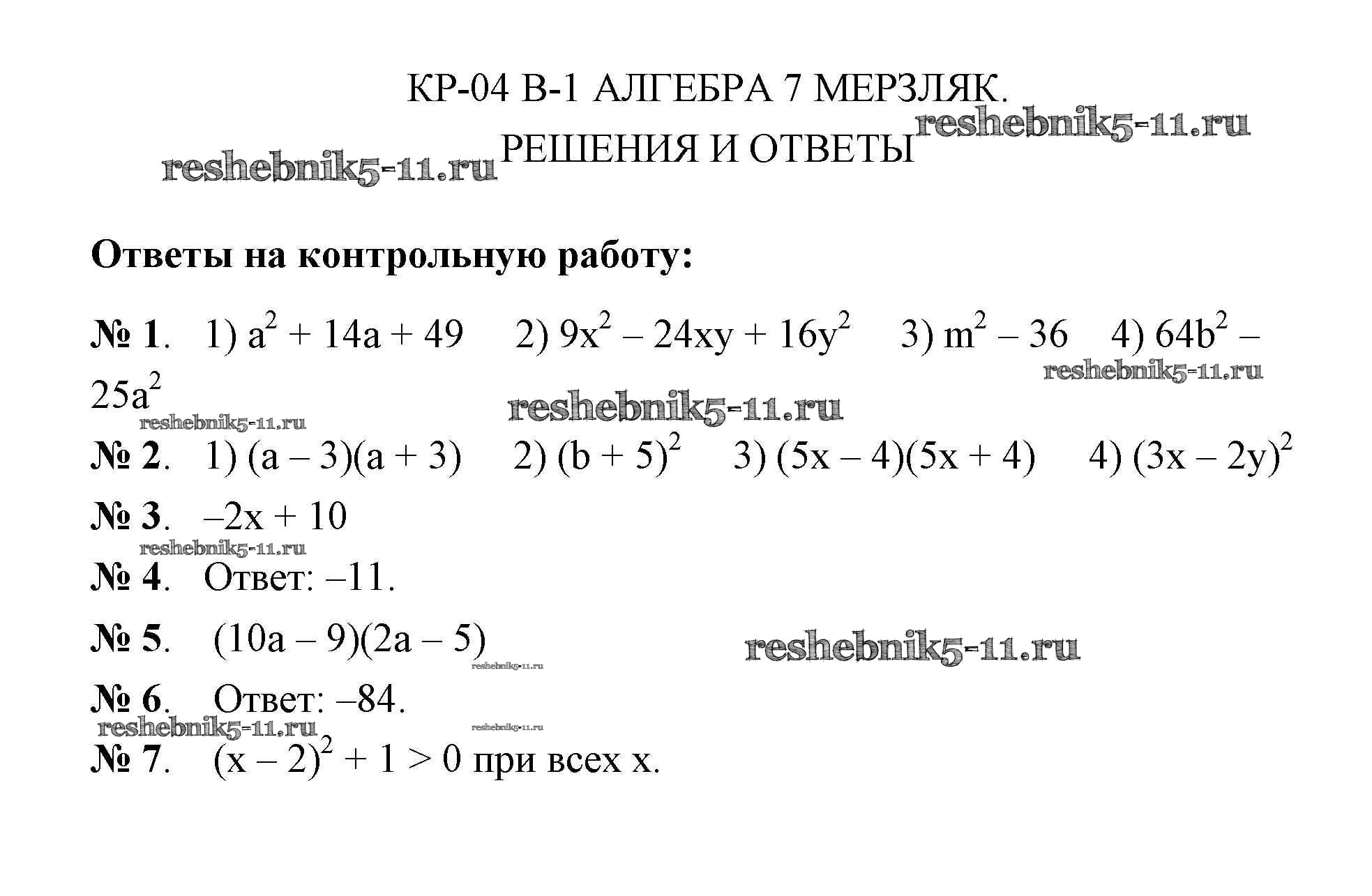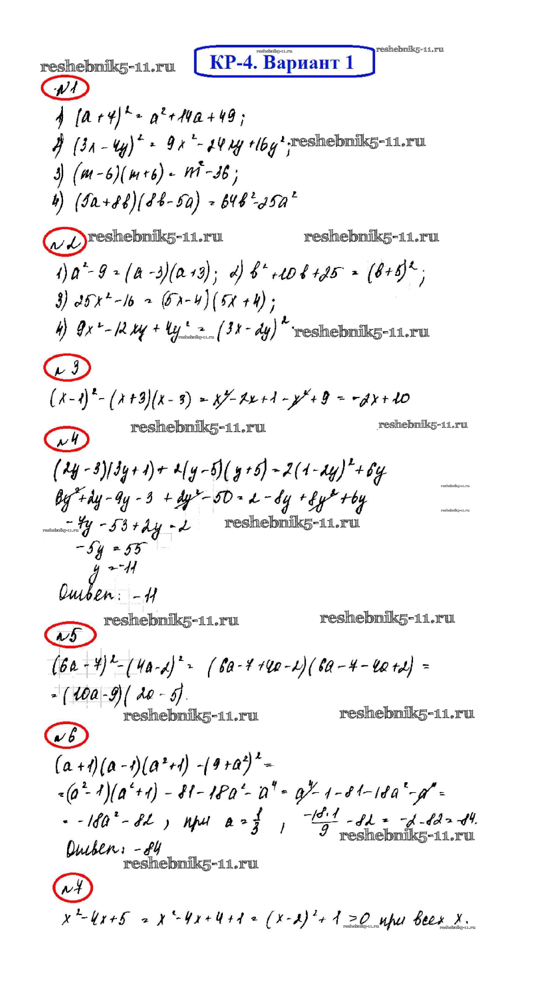 Готовая домашняя работа с ответами по Алгебре за 7 класс Мерзляк, Полонский, Рабинович, Якир Дидактические материалы УМК Вентана-граф 2017 ФГОС - КР-4. Варианты 1