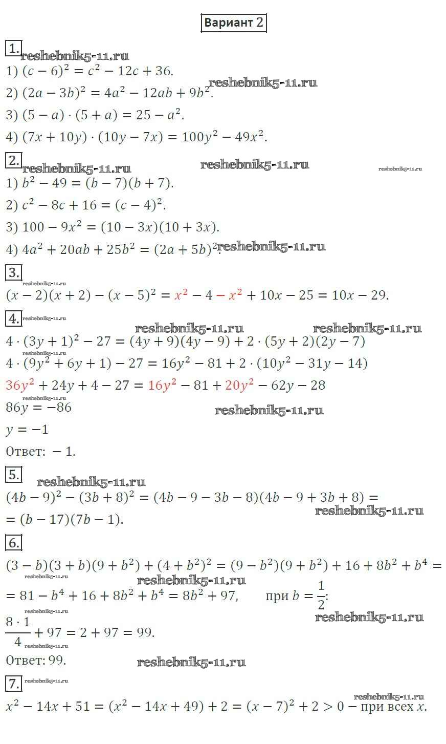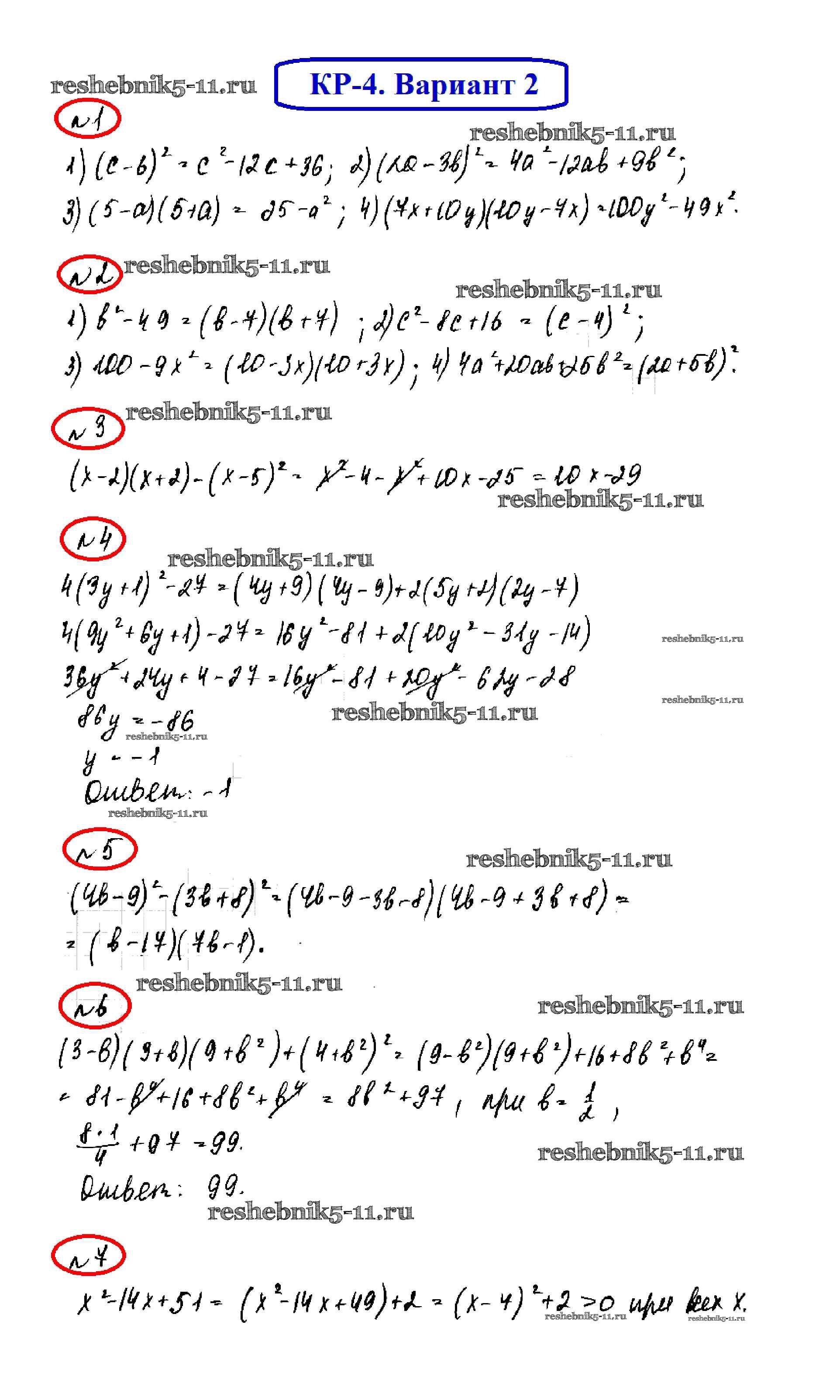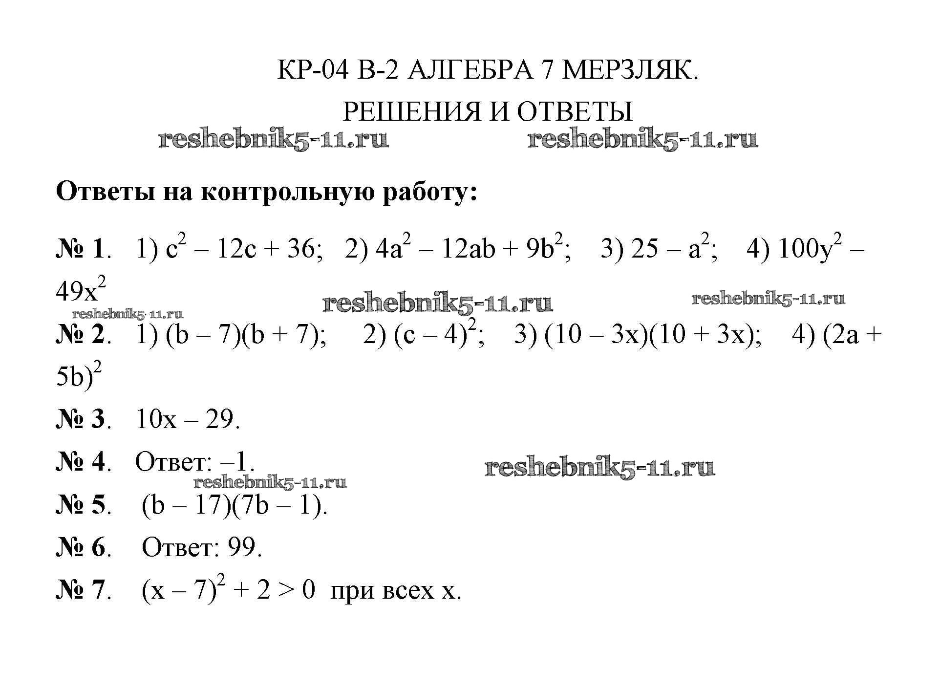 Готовая домашняя работа с ответами по Алгебре за 7 класс Мерзляк, Полонский, Рабинович, Якир Дидактические материалы УМК Вентана-граф 2017 ФГОС - КР-4. Варианты 2
