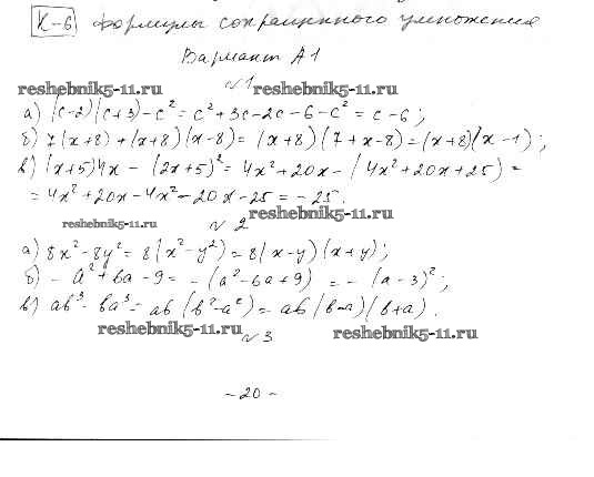 Готовая домашняя работа с ответами по Алгебре за 7 класс Ершова, Голобородько Самостоятельные и контрольные работы Илекса 2015 ФГОС - КР-6. Формулы сокращенного умножения вариант А-1