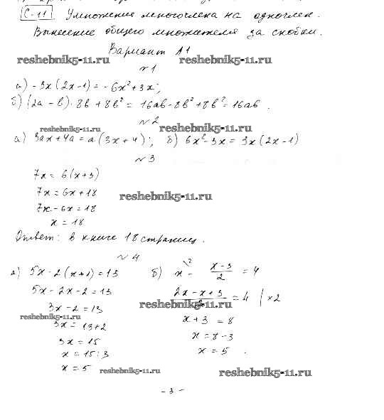 Готовая домашняя работа с ответами по Алгебре за 7 класс Ершова, Голобородько Самостоятельные и контрольные работы Илекса 2015 ФГОС - СР-11. Умножение многочлена на одночлен. Вынесение общего множителя за скобки вариант А-1