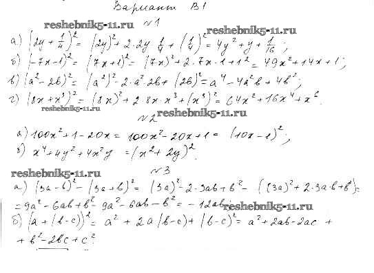 Готовая домашняя работа с ответами по Алгебре за 7 класс Ершова, Голобородько Самостоятельные и контрольные работы Илекса 2015 ФГОС - СР-13. Квадрат суммы и квадрат разности вариант В-1