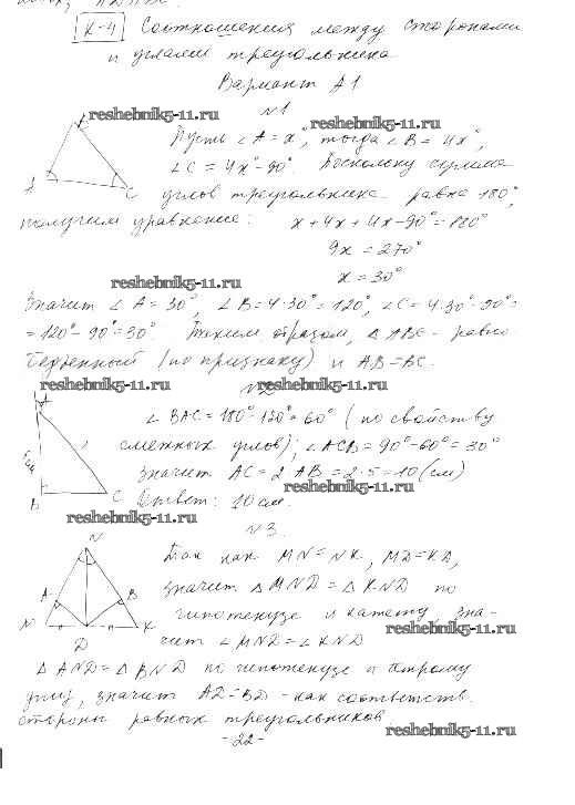 Готовая домашняя работа с ответами по Алгебре за 7 класс Ершова, Голобородько Самостоятельные и контрольные работы Илекса 2015 ФГОС - КР-4. Соотношения между сторонами и углами треугольника вариант А-1