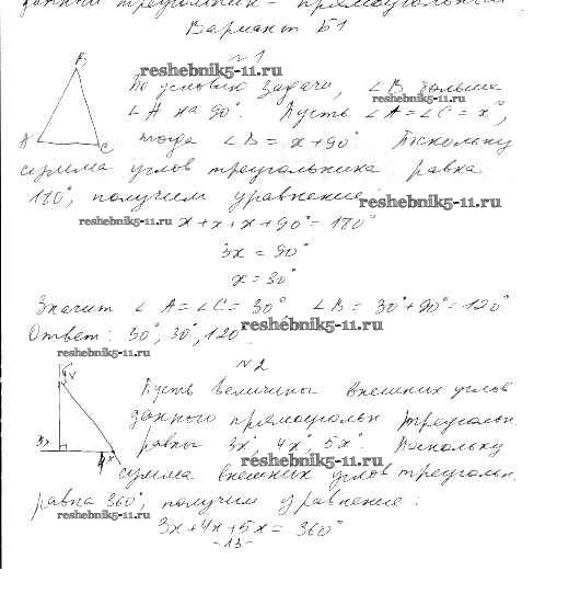 Готовая домашняя работа с ответами по Алгебре за 7 класс Ершова, Голобородько Самостоятельные и контрольные работы Илекса 2015 ФГОС - СР-12. Сумма углов треугольника вариант Б-1