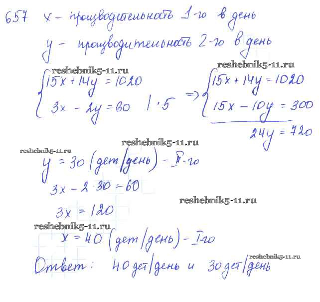 Готовая домашняя работа с ответами по Алгебре за 7 класс Колягин, Ткачёва, Федорова, Шабунин Учебник Просвещение 2014 ФГОС - §37. Решение задач с помощью систем уравнений 657
