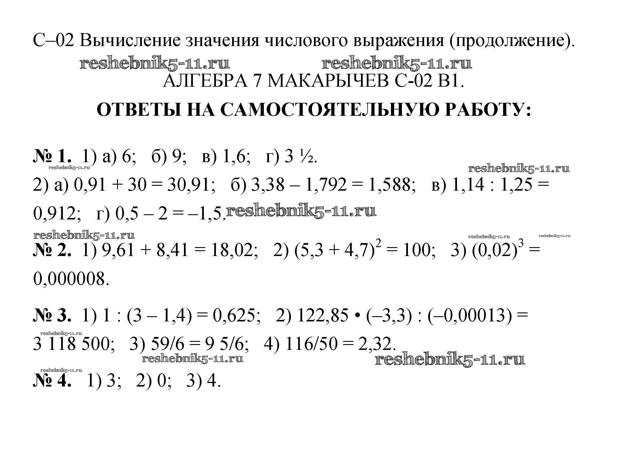 Готовая домашняя работа с ответами по Алгебре за 7 класс Звавич, Кузнецова, Суворова Дидактические материалы Просвещение 2012 ФГОС - Вариант 1 С-2. Вычисление значения числового выражения