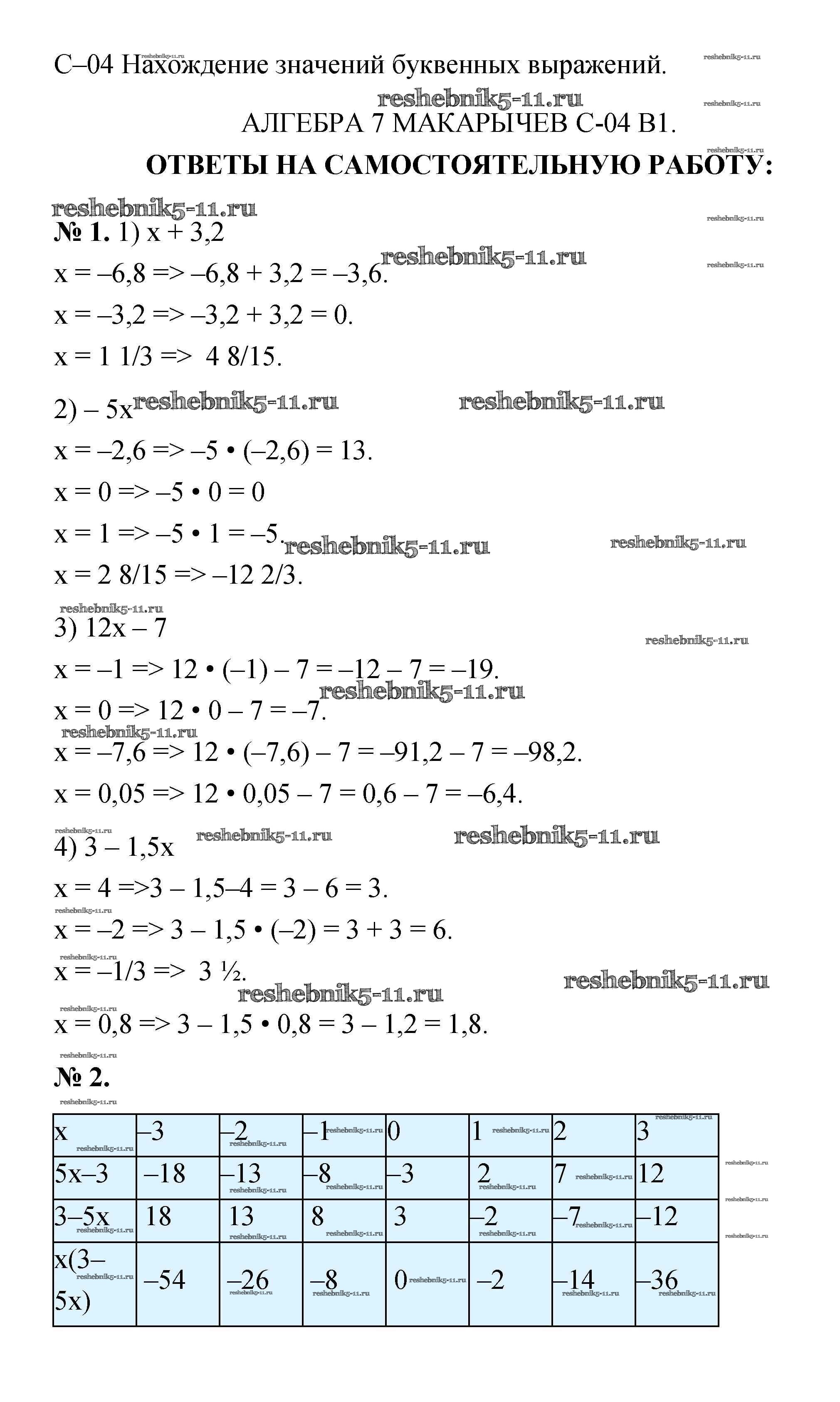 Готовая домашняя работа с ответами по Алгебре за 7 класс Звавич, Кузнецова, Суворова Дидактические материалы Просвещение 2012 ФГОС - Вариант 1 С-4. Нахождение значений буквенных выражений