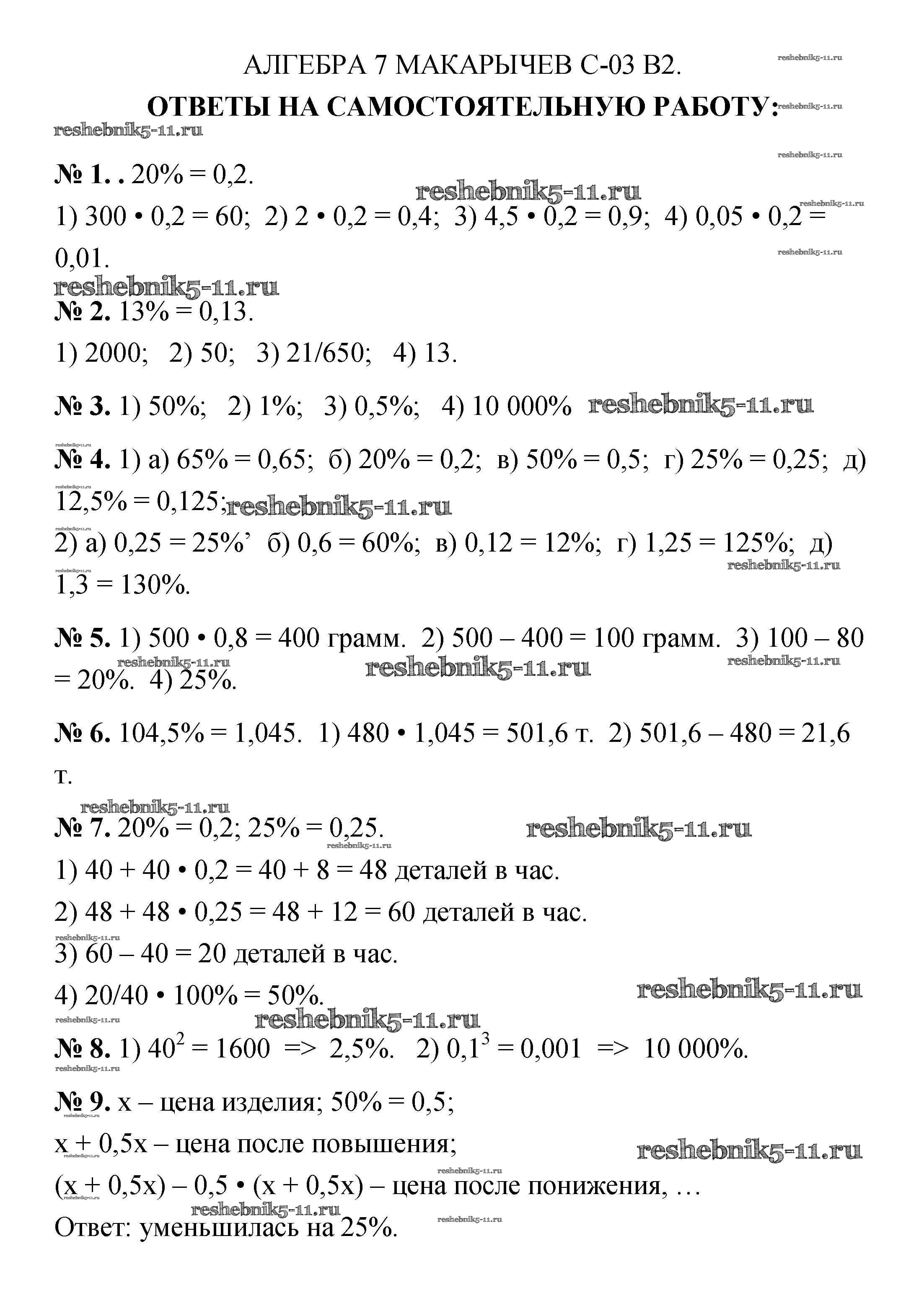 Готовая домашняя работа с ответами по Алгебре за 7 класс Звавич, Кузнецова, Суворова Дидактические материалы Просвещение 2012 ФГОС - Вариант 2 С-3. Решение задач на проценты