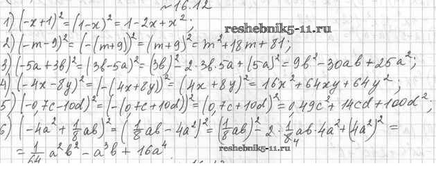 Готовая домашняя работа с ответами по Алгебре за 7 класс Мерзляк, Поляков Учебник Алгоритм успеха Углубленный уровень Вентана-граф 2019 ФГОС - §16. Квадрат суммы и квадрат разности двух выражений. Квадрат суммы нескольких выражений 16.12