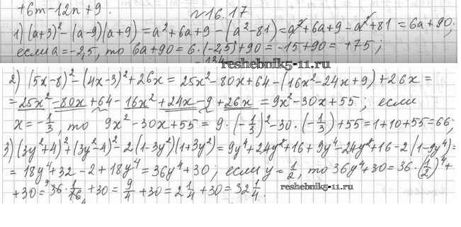 Готовая домашняя работа с ответами по Алгебре за 7 класс Мерзляк, Поляков Учебник Алгоритм успеха Углубленный уровень Вентана-граф 2019 ФГОС - §16. Квадрат суммы и квадрат разности двух выражений. Квадрат суммы нескольких выражений 16.17