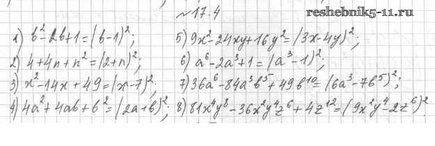 Готовая домашняя работа с ответами по Алгебре за 7 класс Мерзляк, Поляков Учебник Алгоритм успеха Углубленный уровень Вентана-граф 2019 ФГОС - §17. Преобразование многочлена в квадрат суммы или разности двух выражений либо в квадрат суммы нескольких выражений 17.4
