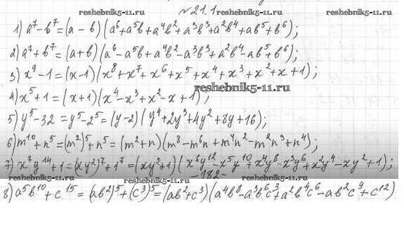 Готовая домашняя работа с ответами по Алгебре за 7 класс Мерзляк, Поляков Учебник Алгоритм успеха Углубленный уровень Вентана-граф 2019 ФГОС - §21. Формулы для разложения на множители выражений вида a^n-b^n и a^n+b^n 21.1