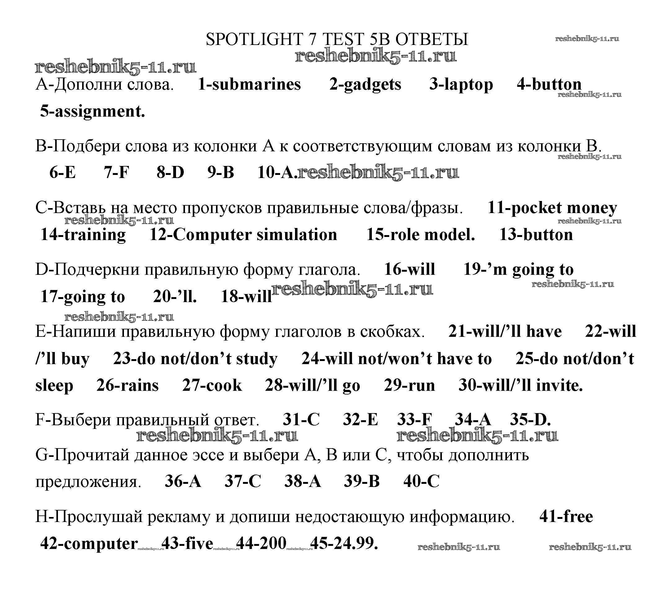 Готовая домашняя работа с ответами по Английскому языку за 7 класс Ваулина, Дули, Эванс, Подолянко Контрольные задания Spotlight Просвещение 2015 ФГОС - Тест 5 2