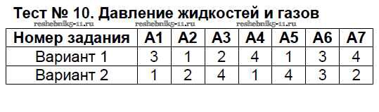 Готовая домашняя работа с ответами по Физике за 7 класс Бобошина Контрольно-измерительные материалы (КИМ) Экзамен 2014 ФГОС - Тесты Тест №10. Давление жидкостей и газов
